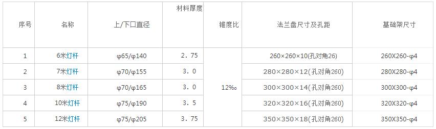 一、標準燈桿尺寸參數表